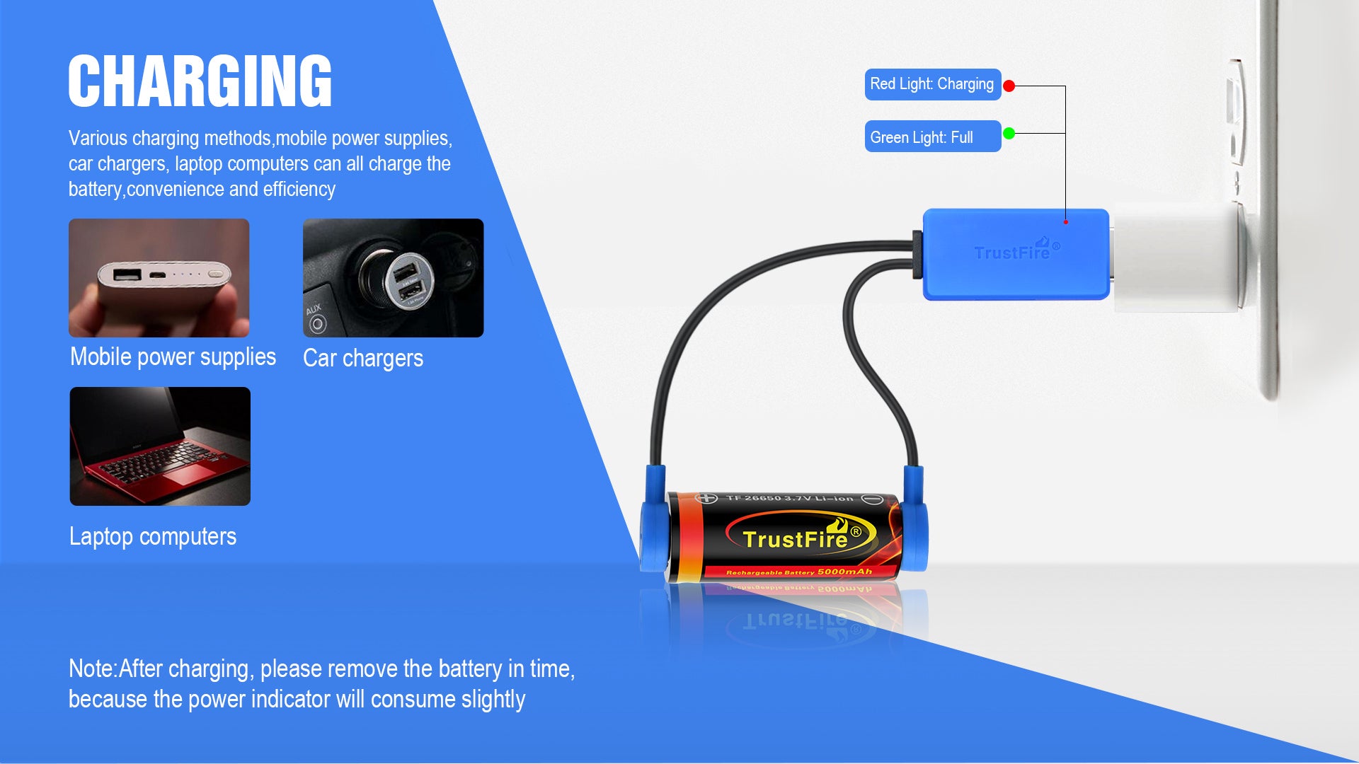 Note: After charging, please remove the battery in time, because the power indicator will consume power slightly.