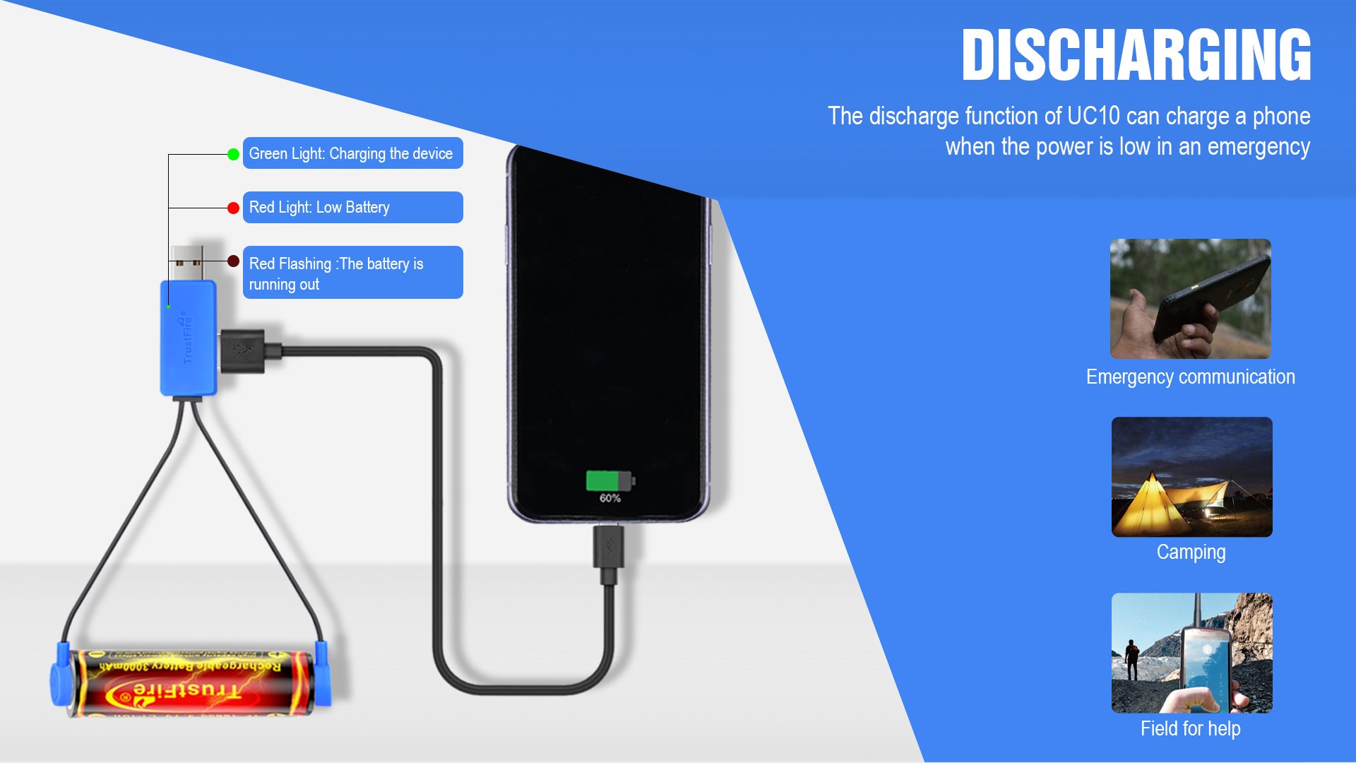 The discharge function of UC10 can charge a phone when the power is low in an emergency.