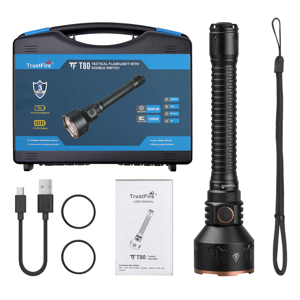 T80 TACTICAL FLASHLIGHT WITH A MAXIMUM OUTPUT OF 3800 LUMENS AND A RANGE OF 1050 METERS